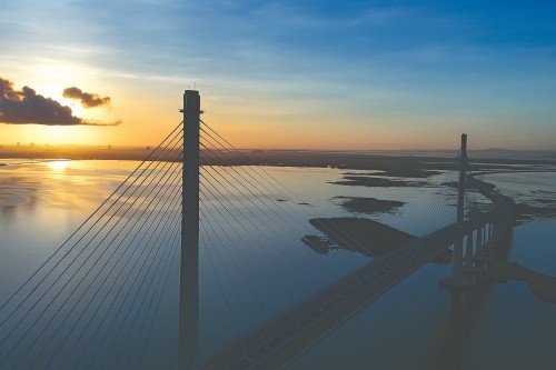 SUNRISE OVER MACTAN AND CCLEX BRIDGE. Sunrise marks a new day that’s still quiet, still peaceful. The early morning sun reflects on the calm Mactan Channel as the Cebu Cordova Link Expressway casts a dramatic shadow.
