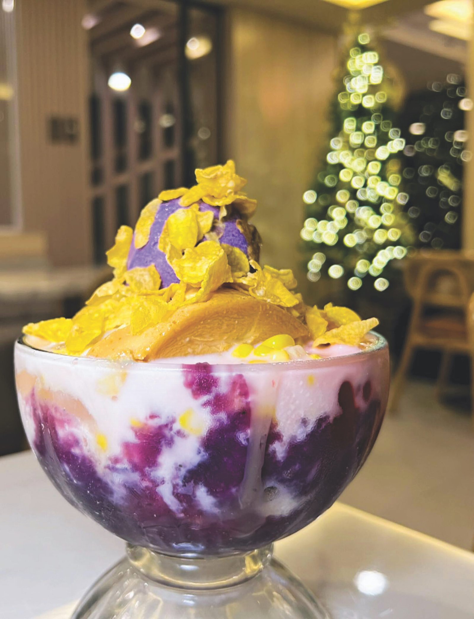 Precious Brew Café may be known for its coffee brews and comfort dishes, but this holiday season, their P150 halo-halo is the star of the menu. Served in a large bowl, it has all the classic mix-ins, just-right sweetness, and finely shaved ice that melts in the mouth with every spoonful. The highlight is the generous ube that makes it richer and more indulgent, blending perfectly with the creamy leche flan. For P150, it’s a nostalgic treat that delivers comfort and pure joy.